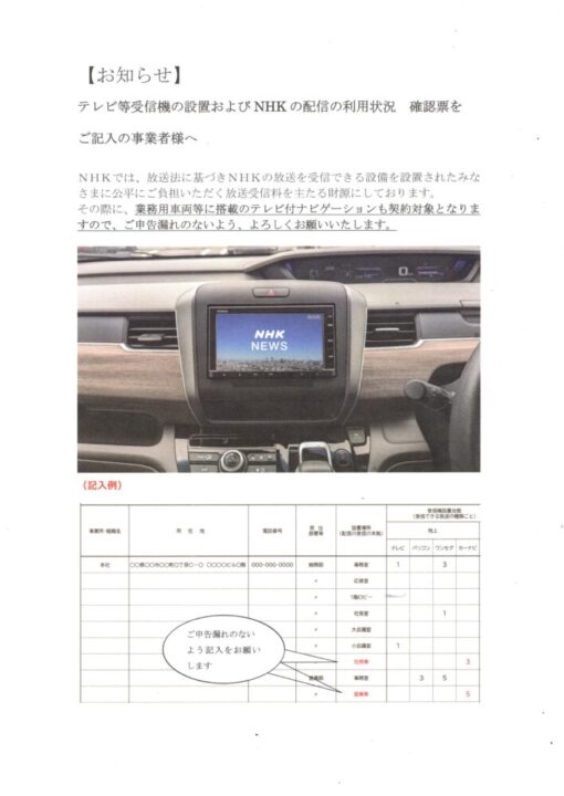 社用車のテレビ、1台ごとに月額 1,100円 1100円×車両台数