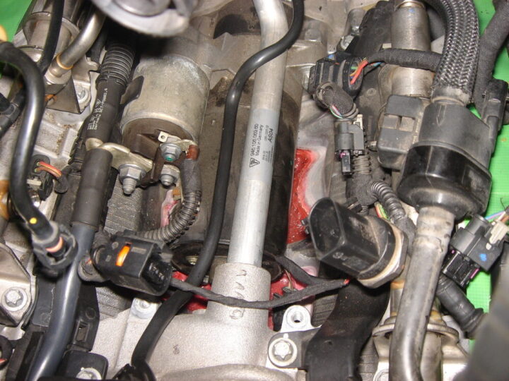 インテークマニホールドを外したところ 赤い冷却水が漏れていました